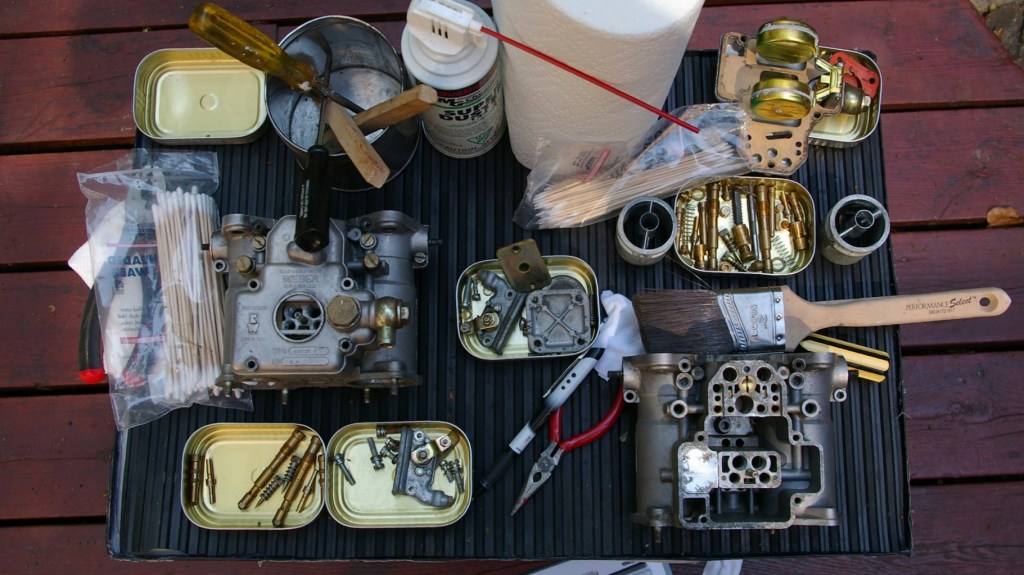 When I found this car I was pleased to find that it had previously run various sets of Weber dcoe carbs. I thought this couldn’t be more perfect. This is something I had always known I’d wanted to do, I love the look of it when mounted on the engines, there’s just something so raw about it, and the intricacies in the tuning is something I’d love to learn. Many prefer the look of these on a 16v since they face forward, so their much more ‘flash’ and in your face, more aggressive looking. On the 8v motor I plan on using the carbs are mounted facing the fire wall, so facing the rear of the car. When you pop the hood and look in it might take a second to realize that yes indeed there is something a little different under the hood. I decided that a set of 40s he had would be a good choice for the engine as well as street ability. Having been wrapped in oiled rags for quite a while they needed a good once over. I prepared a cleaning station and proceeded to clean the exterior with good old gasoline. Nothing cuts through the tough grime quite like it. Once the exteriors were washed I removed the jetting to check condition as well as give them a bath in gas and a good shot of compressed air. I will be doing a more thorough rebuild once I receive some parts that have been ordered. There were a few bits and pieces missing and I wanted to refresh all the o-rings and gaskets. Still debating what style linkage to use as well as what style air filters.